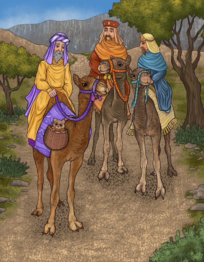 此外,在我们的故事中,骆驼的名字源自中文,图书馆员羿辰亦然。这些名称皆属虚构。难道三位智者可能来自中国?部分学者持此观点。近期发现并翻译的八世纪手稿暗示,智者们或许是经丝绸之路从中国而来。然而多数学者仍不认同此说。正因无人确知他们的来处,我们便能在此故事环节发挥创意。唯一可考证的,仅是《马太福音》2:1-12的记载。这意味着智者确有其人,但我们对他们所知甚少。他们始终是个谜。如同任何未解之谜,总有人渴望调查、寻找线索、试图破解!当这些事件发生在数千年前时,这些侦探可能是考古学家、古文书与古语专家、历史学家或人类学家。