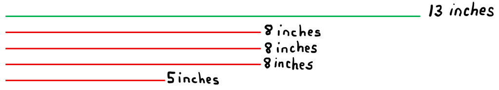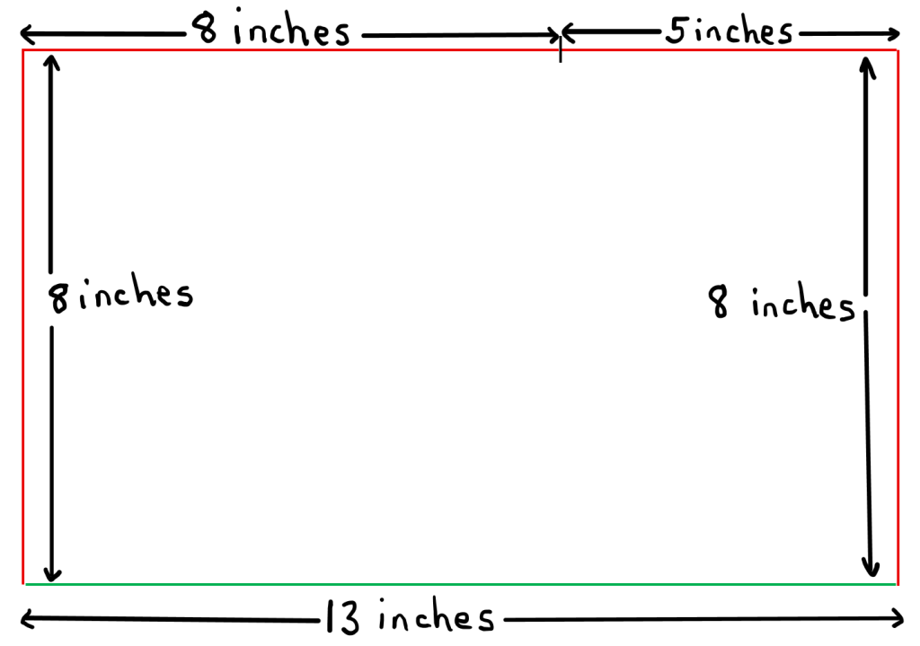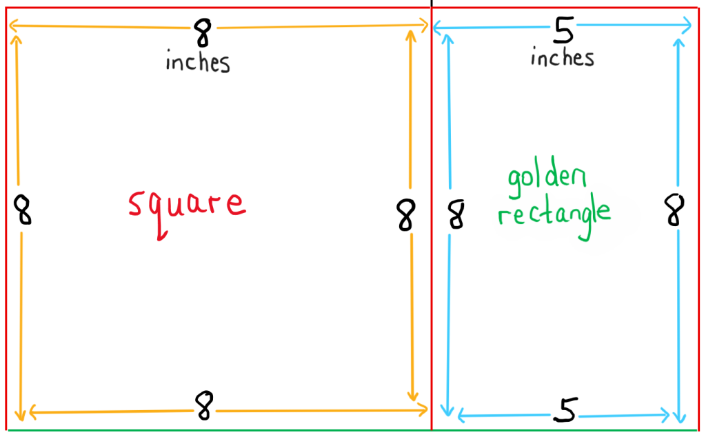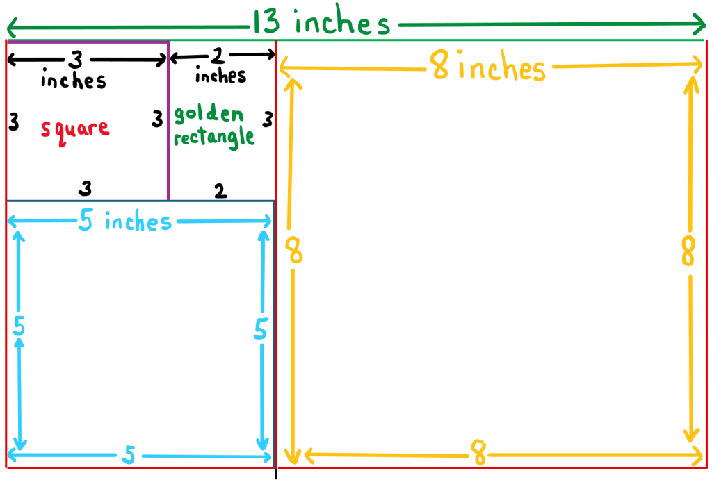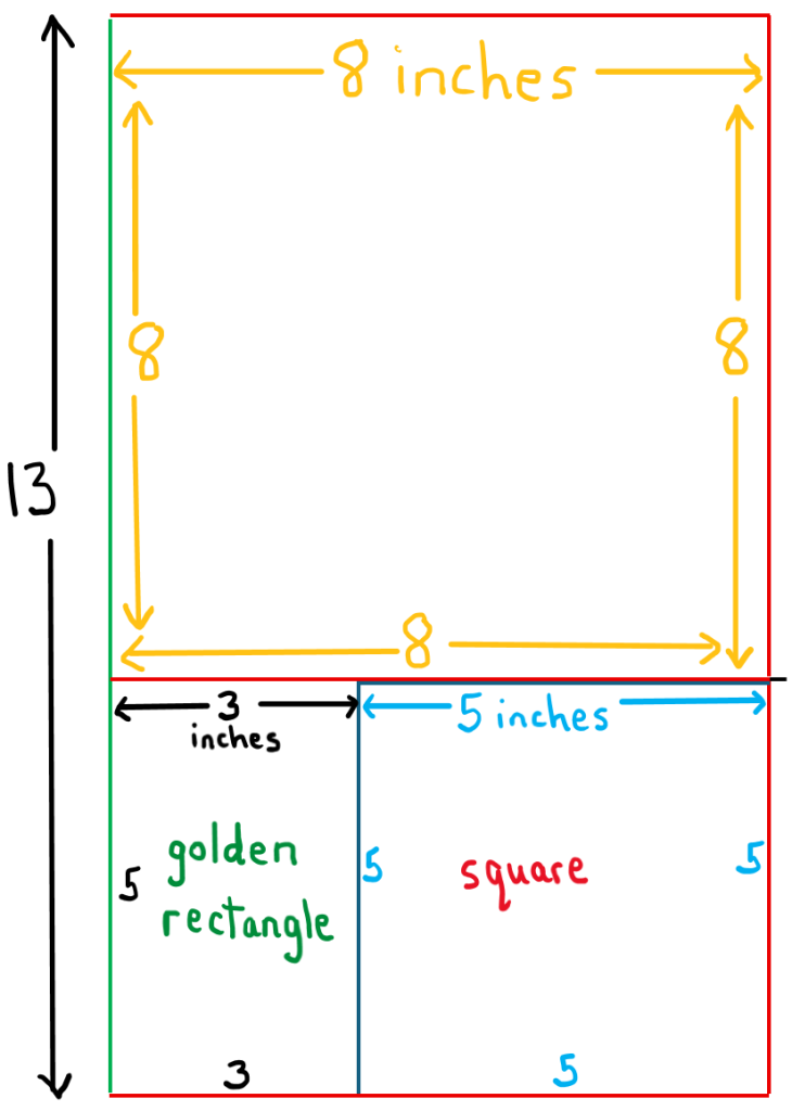 「完美,」安妮卡说。「准备好了。矩形有四条边。顶边要将一条长红线与一条短红线并排放置。所以现在有条8英吋的红线紧挨着5英吋的红线,这边长就是13英吋。对边同样需达13英吋,故用绿色毛线构成矩形底边。左右两侧则使用剩余红线,使左侧宽8英吋、右侧宽8英吋。由于采用符合黄金比例的尺寸,此结构称为黄金矩形。 」