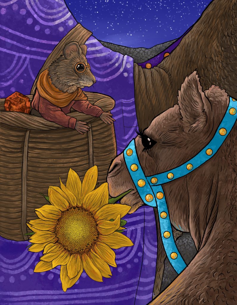 伊森将向日葵置于石块旁,种子则收进鞍袋篮中。「谢谢妳,玛伊,」他说道,「我喜欢当个美的追寻者。」