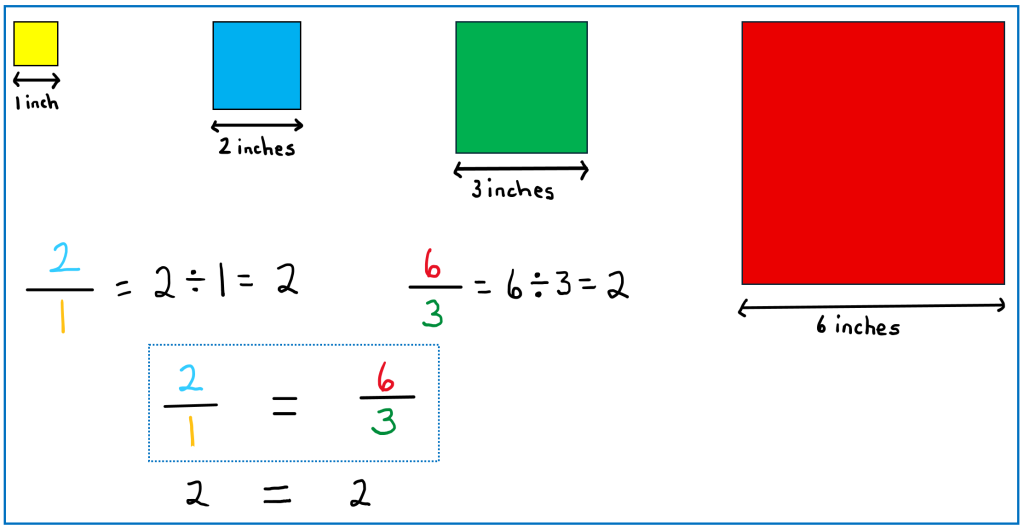 「蓝色纸张每边长度为2英寸,黄色纸张每边长度为1英寸。我们可以看出蓝色纸张比黄色纸张大。运用数学,我们能精确计算蓝色纸张比黄色纸张大多少。这是一个简单的除法问题。我们取蓝色纸张边长除以黄色纸张边长:2 ÷ 1 = 2。若已知蓝色纸张面积为4,黄色纸张面积为1,则可进行面积比运算:4 ÷ 1 = 4。此除法运算结果称为比例。」