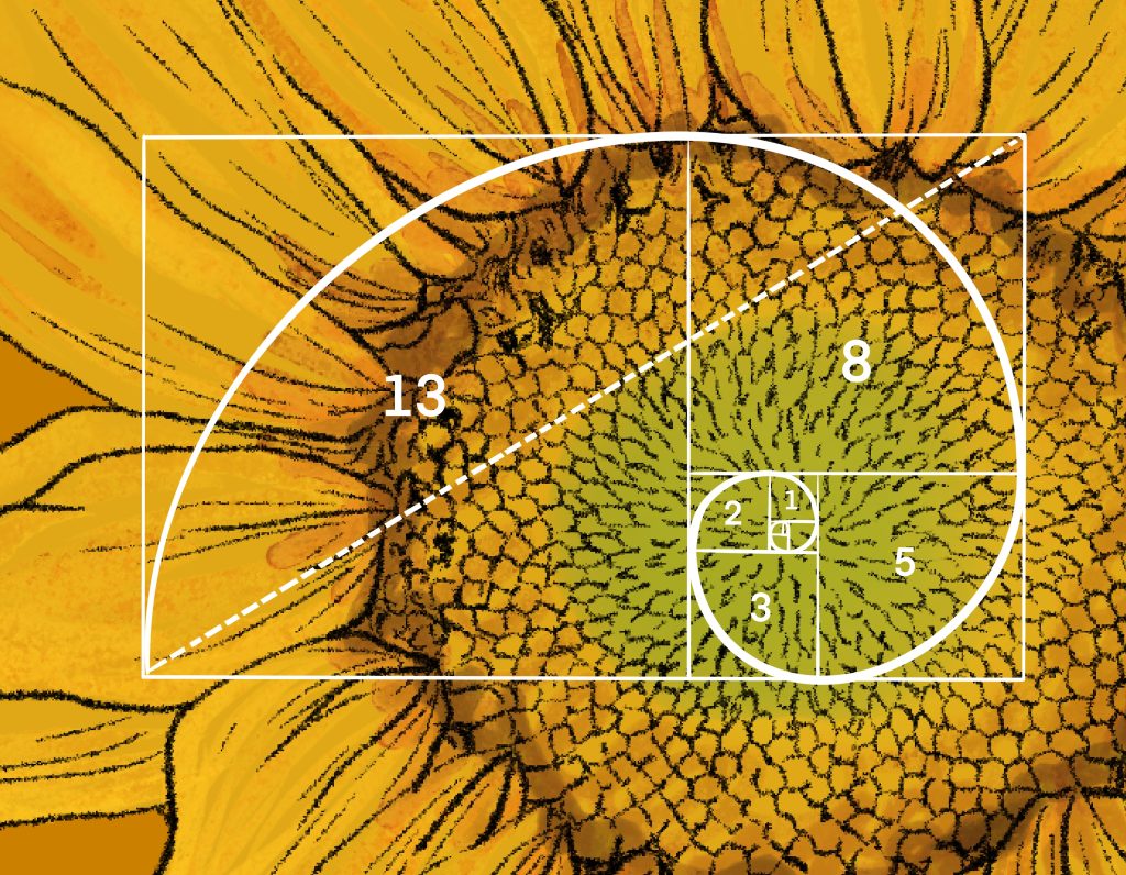 「每当我们绘制一个黄金矩形,便能将其旋转并在内部生成更小的矩形。这些矩形的所有长度与宽度皆源自斐波那契数列。随着越来越多小型矩形迭加,整体将呈现特殊螺旋形态——此现象遍布自然界。例如:向日葵中心籽粒的排列、松果的结构与花瓣的分布、叶片环绕茎干的排列、银河系等螺旋星系的形态、某些蜘蛛网的设计、飓风的螺旋轨迹,甚至人类的身体结构皆可窥见其踪迹。