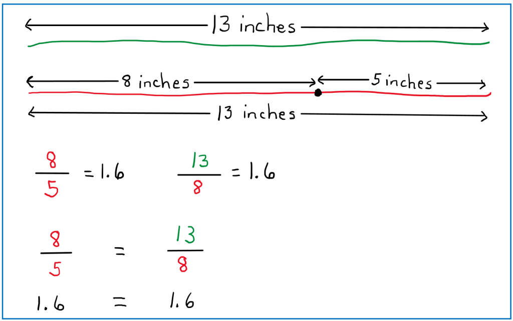 「要观察黄金比例,我给你们每人两段毛线。一段绿色,一段红色,长度皆为13英寸。我在红在线标记了黑点,请沿着黑点剪断。现在你们的红线分成两段:8英寸与5英寸。若将两段并排,总长度恰如绿线的13英寸。接着我们将计算两个比例:首先用较长的红线除以较短的红线,即 8 ÷ 5 = 1.6,此数值接近黄金比例。另一比例则用绿线总长除以较长的红线段,即 13 ÷ 8 = 1.6。现在将这两组比例并列呈现: