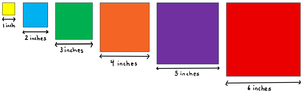 「当然,」西奥说:「我知道莫穆尔今天要我教你们这个,所以我给你们每人六个彩色正方形,并在每个正方形上标注了边长。你们手上的正方形包括: