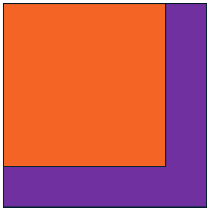「现在用橘色和紫色正方形重复同样的步骤。将橘色正方形嵌入紫色正方形的一个角落。最后,对绿色正方形和红色正方形也做同样的操作。现在你会得到三堆图形。其中两堆是成比例的。猜猜看?」