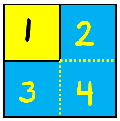 「将黄色正方形置于蓝色正方形顶端,使其精准嵌入蓝色正方形的一个角落。此时应呈现出蓝色正方形可容纳四个黄色正方形的视觉效果——因蓝色正方形每个角落皆可容纳一个黄色正方形。若有黏着剂,可将黄色正方形黏贴于蓝色正方形角落之一。确保两者边缘接合平整整齐。」