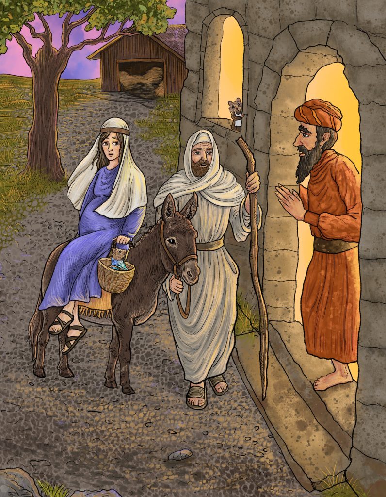 「我期待着一捆好草料、一槽清水和树荫,」驴子多蒂说。「但更重要的是,我庆幸玛利亚很快就能躺上舒适的床铺。她在我背上颠簸得厉害,我都担心那孩子会直接弹出来呢!」